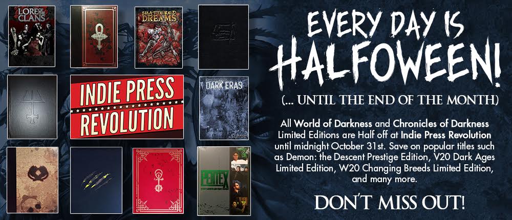 - Indie Press Revolution’s Halfoween sale: Did you miss a Kickstarter? You can get remaining World of Darkness deluxe editions or Chronicles of Darkness prestige edition stock for 50% off! Includes great products like V20 Dark Ages, W20 Book of the Wyrm, the Mage20 rulebook, and Beast: The Primordial!