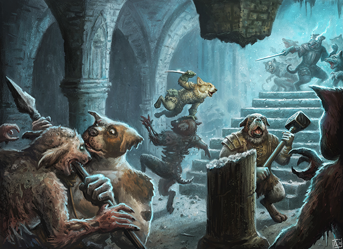 Next, don’t be afraid to push the boundaries. A lot of players have remarked that Pugmire has a lot of “white space,” areas of the game world that aren’t detailed or explained. That’s absolutely intentional! The whole concept of Vinsen Pug having a secret tomb was largely just so I could write this adventure. And the adventure itself leaves more open space, leaving open the question of why a demon wants to destroy Vinsen’s sword and shield. In the same vein, don’t be afraid to use loose threads for future adventures — Derry Lurcher’s story comes from the existence of Rondo Border-Collie (another demon-possessed mercenary), and while they don’t directly connect, there’s clearly some elements in common between the characters.
